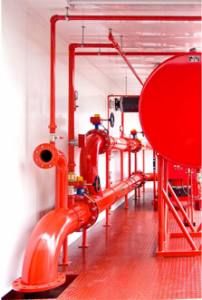 A pump with a diesel or electric engine with parameters matched to the requirements of the protected structure,- A Jockey pump counteracting losses of pressure in the system,